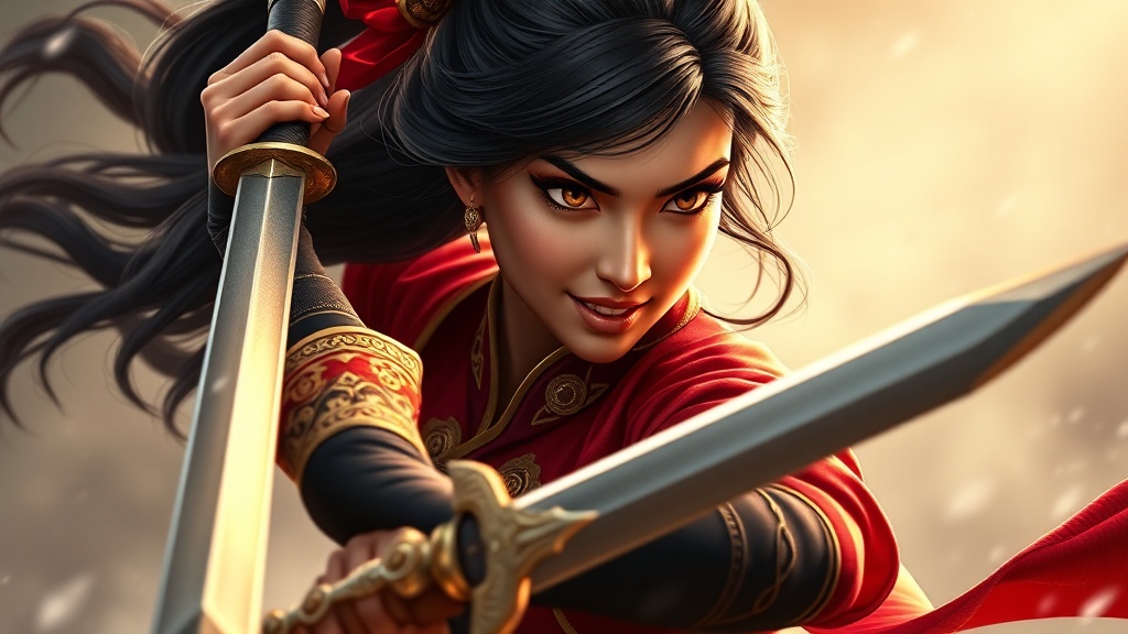 A digital portrait depicting a fearless warrior with a determined, fierce smile, reminiscent of Disney's Mulan. She wields a glistening sword and wears a vibrant red and gold ensemble, exuding a strong and courageous presence. Her dynamic pose showcases her powerful and commanding demeanor, with piercing eyes and flowing raven hair capturing the essence of her bravery. This portrait, inspired by Martin Ansin's art style, is set in a dramatic and intense soft focus, highlighting her regal and formidable nature. The image is rendered in ultra high definition, accentuating every intricate detail of her attire and expression.