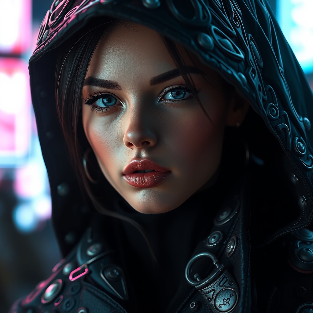 A cinematic portrait of a young European woman dressed in a storm rain movie coat with futuristic sci-fi fashion elements. She embodies royal elegance with an outfit inspired by the styles of Ismail Inceoglu, Dragan Bibin, and Greg Rutkowski. Her face is perfectly defined, with sharp features and intricate detailing. The setting evokes a cyberpunk aesthetic reminiscent of Neo-Tokyo and synth-wave, complete with low-emission neon lights captured in a Blade Runner-esque scene. The dramatic lighting enhances her allure, captured in a hyper-realistic, ultra-high-resolution 8K photograph. The image showcases lifelike textures with rich, vibrant colors, employing advanced CGI techniques. The overall atmosphere is one of high contrast and realism, akin to photography with an f1.6 lens. Despite her doll-like, almost animated appearance, the portrayal remains grounded, avoiding exaggerated or deformed features, ensuring a seamless blend of futuristic style with classic beauty, all in a sophisticated, unified composition.