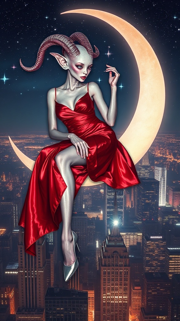 An ethereal fashion photo of a female alien with shimmering iridescent skin and elegantly curved horns, lounging on a crescent moon that floats just above the iconic skyline of New York City. She is adorned in a flowing deep red dress that glistens like liquid silk under the city lights, paired with sleek silver high heels that accentuate her elongated limbs. Her eyes reflect the twinkling stars as she gazes down at the bustling metropolis below, creating a captivating juxtaposition between celestial beauty and urban landscape.