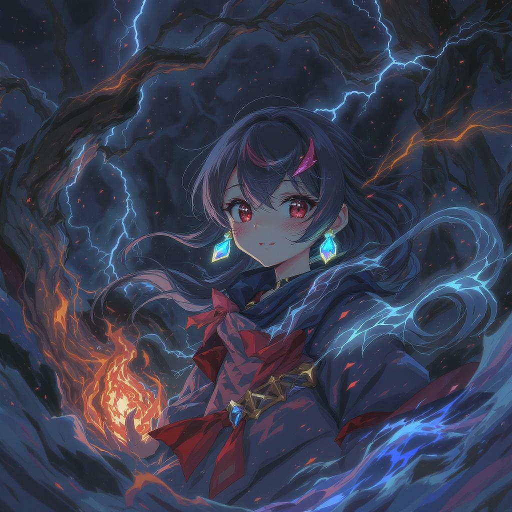 Enchanting portrait of a young girl surrounded by elements of magic lightning, fire, ice, water, and wind, depicted in a style inspired by detailed dreamscapes. The scene glows with vibrant colors, set in a mysterious nocturnal environment. Her features are enhanced by iridescent and opalescent earrings amidst a slightly dirty face highlighting her adventurous spirit. The setting is atmospheric with volumetric lighting adding depth to the composition. This cartoonish anime-inspired illustration showcases a unique blend of fantasy and reality, capturing the essence of her powers. Despite the slightly blurred details and minor imperfections, the focus remains on her ethereal beauty and the surreal elements around her, lending a painterly and dreamlike quality to the image.