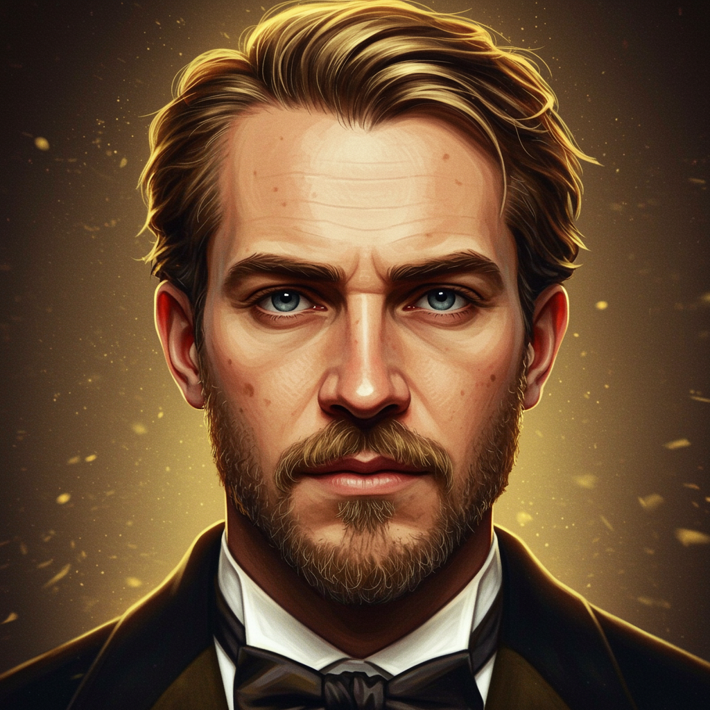 A close-up portrait of a man with dark blond hair, prominently defined nose, and clean-shaven face, capturing intricate facial details with a serious expression. He is dressed in elegant attire, showcasing the upper body, with a focus on head and shoulders. The artwork is conceptualized in 8k resolution, inspired by the styles of dmc_kay and WLOP, featuring dynamic lighting and hyperdetailing. The portrait incorporates a fusion of triadic colors and volumetric lighting, with artistic nuances that add a sense of realism and depth, creating an engaging piece that is both modern and timeless.