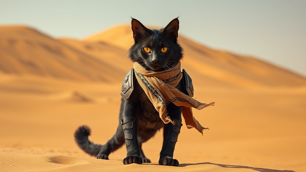 In the vast, arid landscape of the planet, an anthropomorphic feline with dark, curly fur stands confidently in the shifting sands. Its expressive eyes glint with determination under the harsh desert sun. Wearing intricately designed full armor, the cat's sleek form is protected yet agile, with a flowing scarf tied snugly around its neck, fluttering in the arid breeze. The scene is captured with a Sony A7 III and Canon RF 24-70mm f/5 L IS USM lens, showcasing an ultrawide, hyper-detailed perspective that highlights the towering dunes and the vibrant textures of the landscape, adding depth and intrigue to the surreal and captivating portrayal of this feline Paul Atreides.