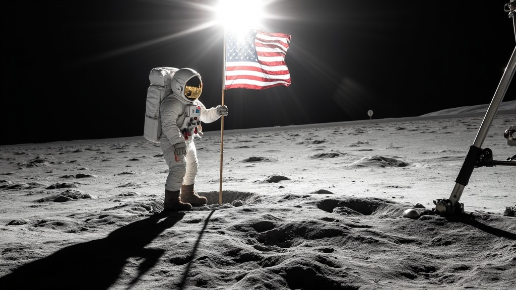 Through the visor of my helmet, I see the stark lunar landscape stretching out before me. My gloved hands firmly grip the American flag pole, the boot prints behind me a testament to my journey across the moon's surface. The pole presses halfway into the fine, gray dust, and the flag begins to unfurl silently in the absence of atmosphere. The sun's intense glare reflects off my visor, creating a dazzling halo of light. To my right, the leg of the lunar module stands as a reminder of my connection to Earth. The shadows cast on the moon are sharp and defined, every detail captured with the clarity of a Hasselblad camera. This moment is a fusion of history and timeless exploration.