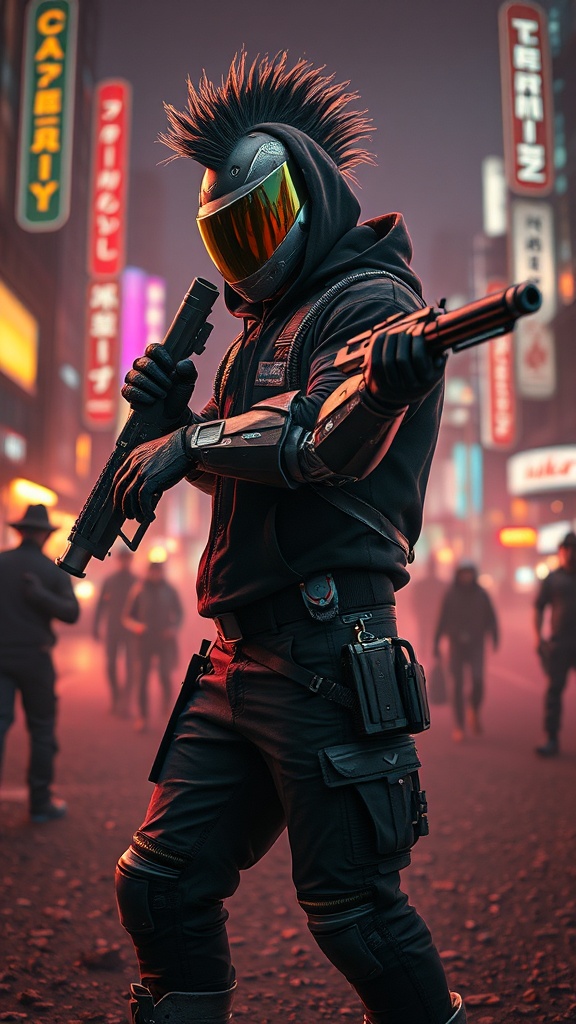 A breathtaking full-body shot capturing a cyberpunk masterpiece, with intricate raw photography and a realistic, highly detailed 3D rendering. The scene is set in a cowboy-themed, photorealistic environment featuring a surreal, atmospheric, and sinister background. An individual adorned in advanced cyber armor and an exo-suit stands out, showcasing mechanical arms and a Daft Punk-inspired cyber helmet equipped with a sophisticated HUD. They sport an oversized black tactical hoodie, black techwear cargo pants, and black tactical gloves, exuding a punk-rock rebel vibe with a striking mohawk. The setting is a futuristic urban landscape, bathed in the neon glow of a cyberpunk city. Amidst a dynamic angle, the subject adopts an aggressive pose, wielding high-tech weapons. The scene is enriched with vibrant colors, dramatic lights and shadows, and precise focus, presenting a cinematic sci-fi tableau evocative of synthwave influences. The overall image achieves photorealistic quality with Octane rendering, poised to be Photo of the Year and undoubtedly Insta-worthy.