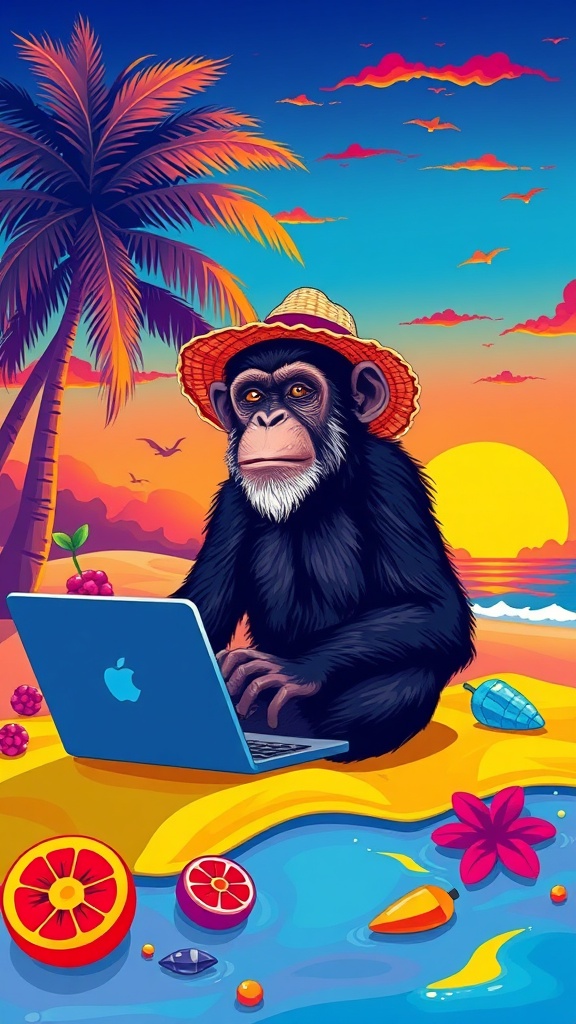 View this AI-generated image featuring vector illustration of a monkey wearing a sun hat lounging on a colorful beach with a laptop developing ai applications surrounded by vivid tropical elements and a vibrant sunset in the background. Created using advanced AI technology, this image showcases vibr