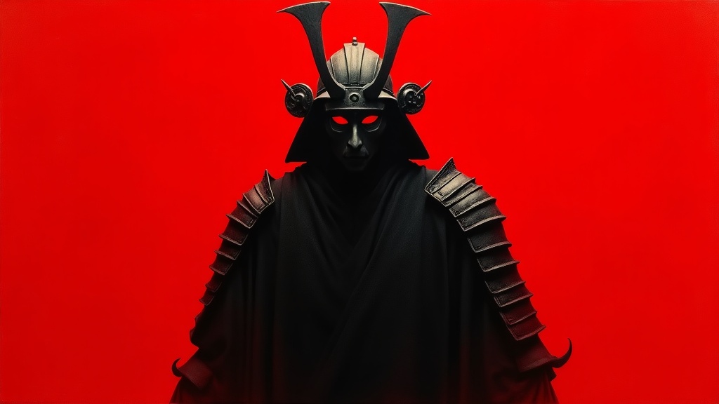 A towering, enigmatic silhouette looms against a vivid crimson backdrop, partially veiled in shadow. The figure's attire resembles ancient armor, suggestive of samurai influence, with articulated plates apparent on the shoulder and upper arm. The focal point is a sinister mask, adorned with small horns or protrusions and hollow eye sockets, imbuing the figure with a demonic or ethereal air. The mask and armor are painted in deep grays and blacks, creating a stark contrast against the bright red background. The atmosphere is one of intimidation and intrigue. The medium is likely acrylic or gouache on paper or board, with visible brushstrokes and a textured application of paint, particularly in the red background. The dramatic lighting highlights the figure, providing a sharp contrast with the red background. The composition is tightly cropped, concentrating on the figure's upper body, which accentuates its formidable presence.