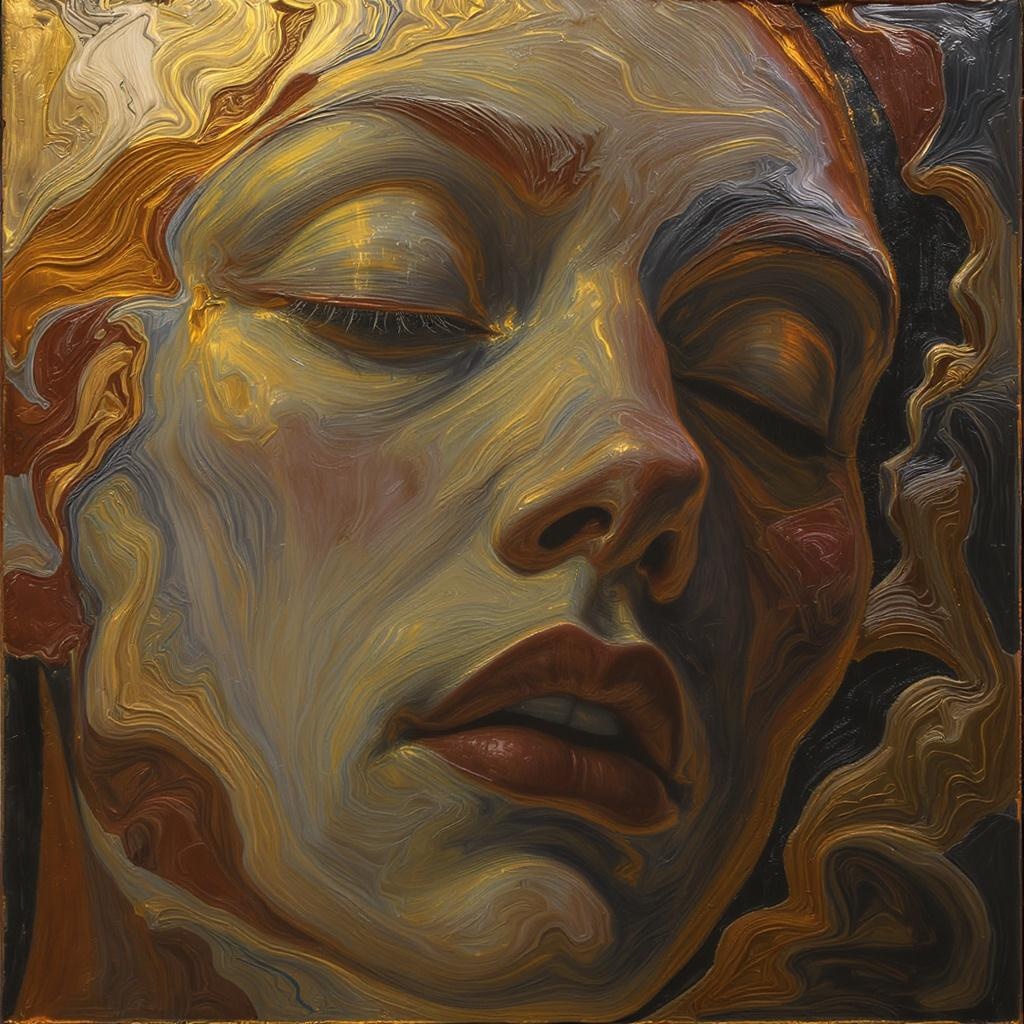View this AI-generated image featuring a surreal oil painting depicting a person s face in close up bathed in warm golden light that highlights their serene closed eyes and gently illuminated skin the textures appear to ripple and melt with visible brushstrokes creating a tactile sense of depth the