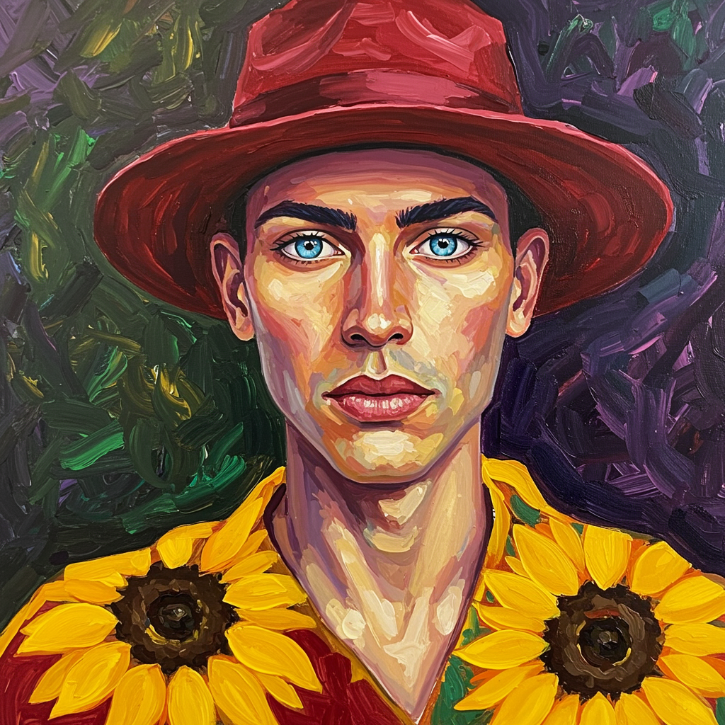 View this AI-generated image featuring a vivid and expressive portrait painting with striking colors depicting a person with piercing azure eyes adorned in a crimson hat and a sunflower yellow shirt the background is a swirl of deep purples and greens enhancing the dramatic effect while the subject