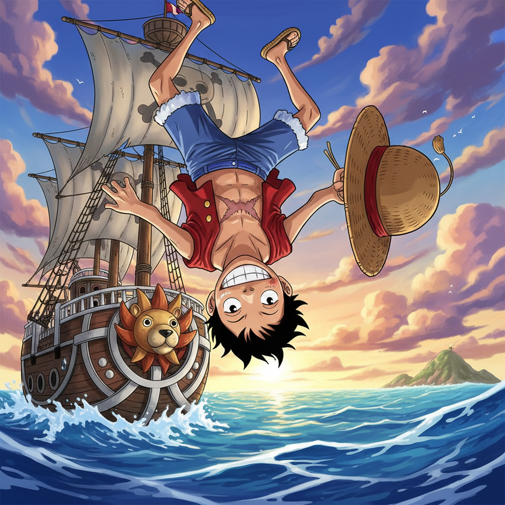 View this AI-generated image featuring create a vibrant high resolution anime style illustration of monkey d luffy and the straw hat pirates crew standing triumphantly on the deck of the thousand sunny ship during a stormy sea adventure luffy is in the foreground with his signature straw hat grinnin
