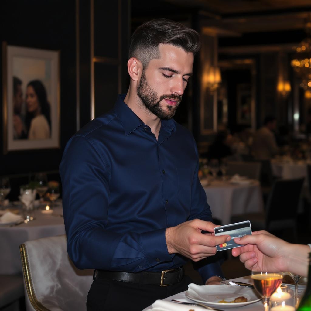 A hyper-realistic image of an attractive Caucasian man with dark burst-taper hair and a neatly trimmed beard, his appearance exudes sophistication. He's dressed in a tailored navy-blue business shirt paired with stylish black cotton dress pants. Situated in a chic, modern restaurant with dim ambient lighting, the atmosphere hints at luxury and exclusivity, with elegantly set tables and opulent decor. The man is confidently making a payment using his VISA credit card, his demeanor poised and assured. The background features blurred images of other patrons, adding depth and context to the scene. The entire image is captured in high resolution, emphasizing the sharp details and lifelike qualities.