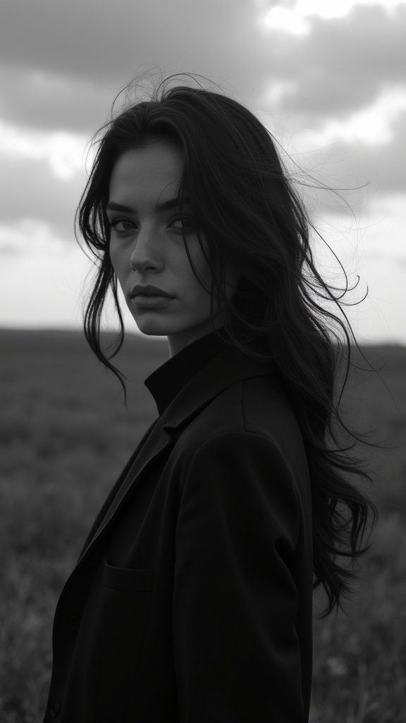 View this AI-generated image featuring a high resolution black and white fashion editorial portrait of a stunning dark haired woman set against a natural backdrop featuring a dramatic sky that adds depth to the scene the interplay of light and shadows enhances the realism capturing her in a cinemati