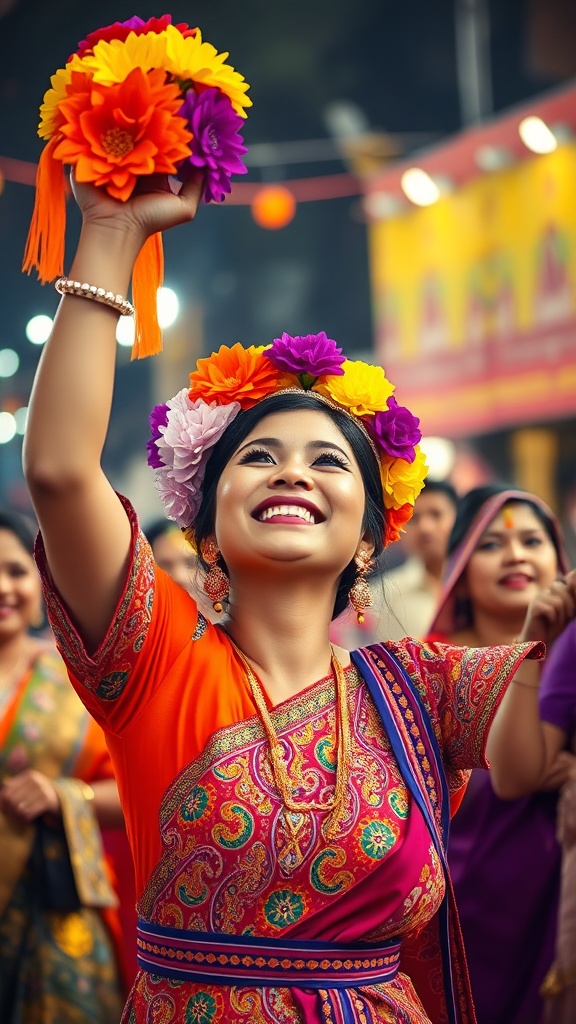 The scene captures a euphoric moment, centered on a beaming woman dressed in vivid traditional attire, representative of a culture renowned for its bright garments. Her outfit is lavishly decorated with intricate and colorful patterns, complemented by a headdress adorned with dazzling flowers that infuse a burst of hues into her look. She raises a beautifully crafted item toward the sky, possibly symbolizing a festival or celebration, with an expression of pure joy and delight. Her eyes are closed, and her head is slightly tilted back, suggesting she is deeply absorbed in the festivities. In the background, more participants can be seen, similarly clad in traditional garments, enjoying the event, indicating a rich communal or cultural celebration. The warm, soft lighting enhances the celebratory ambiance, giving the scene an energetic and vibrant atmosphere.
