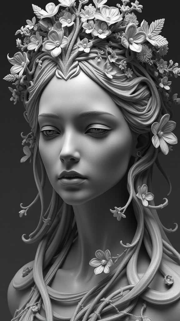 A hyper-realistic sci-fi sculpture featuring a woman adorned with an intricate and elaborate crown, crafted with meticulous detail using techniques reminiscent of ZBrush. The monochromatic artwork showcases her serene expression, with her features seamlessly blending with elements of nature, such as intertwining vines and delicate floral motifs, which are intricately carved into her crown and cascading down her shoulders. The sculpture captures the essence of a futuristic yet organic harmony, with delicate textures and subtle contrasts, evoking a sense of timeless elegance and otherworldly beauty.