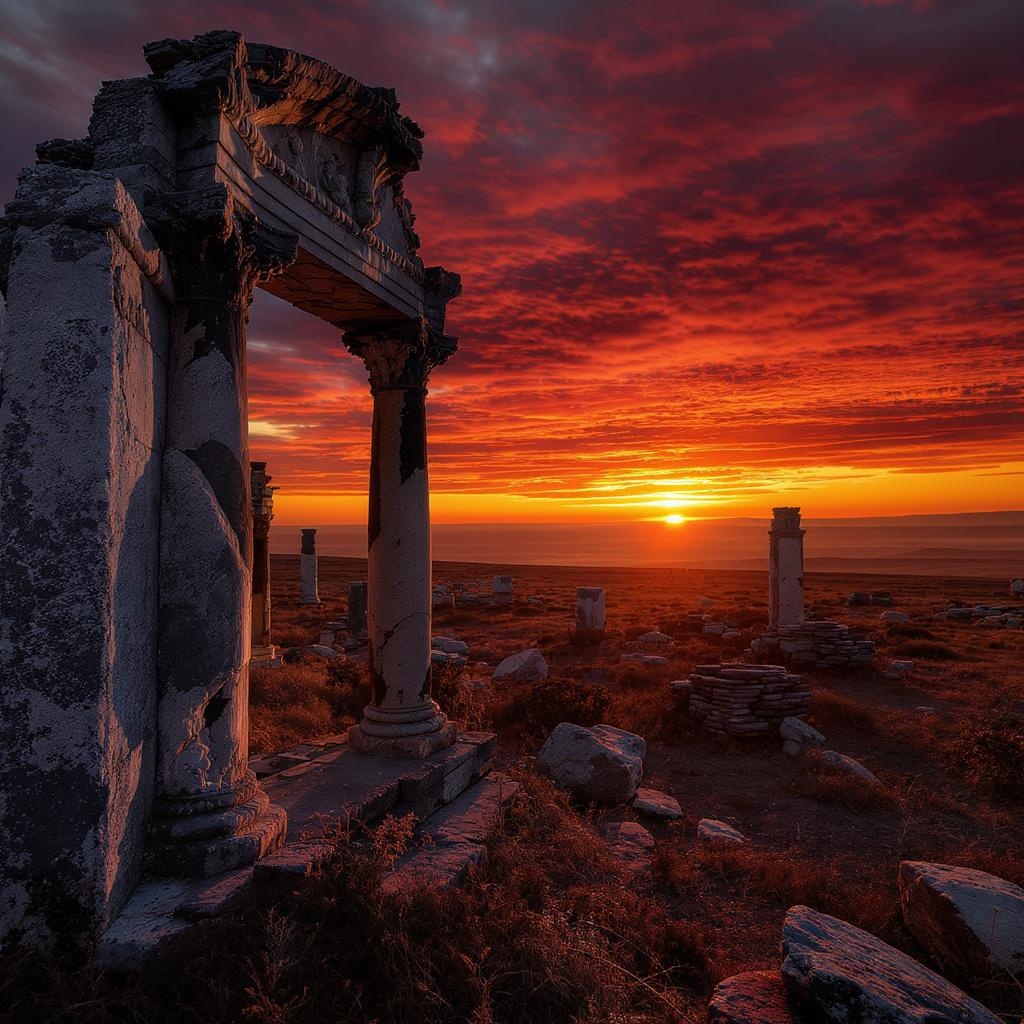 Ancient ruins sprawled across a deserted landscape under a dramatic sunset, the epic sky painted with vibrant hues of orange and purple. The scene is cinematic and breathtaking, capturing the intricate details of the crumbling stone structures. The foreground features a sharp focus on worn carvings, while the background fades into soft focus, enhancing the sense of depth. The overall composition is highly detailed, reminiscent of a studio photo, echoing the artistic style of a Greg Rutkowski masterpiece, with subtle variations highlighting the timeless beauty of these forgotten relics.