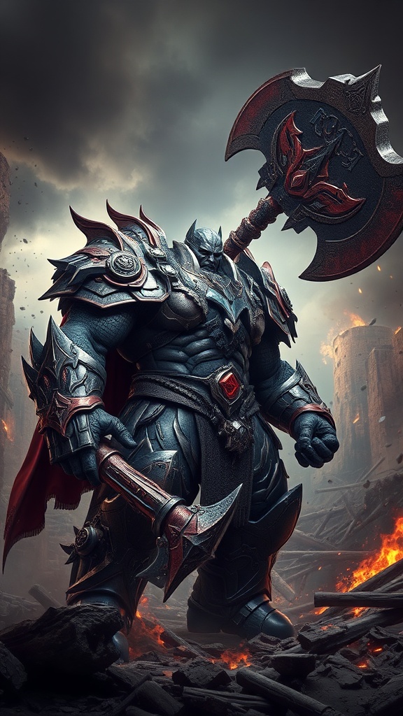Capture Worldbreaker Sion in a hyper-realistic photograph set amidst a chaotic, apocalyptic landscape, showcasing his massive and imposing physique, intricately detailed armor, and signature colossal axe. Employ advanced lighting techniques and dynamic posing to emphasize his fierce, unrelenting expression, conveying a powerful sense of destruction and devastation. Utilize a muted, desaturated color palette with striking pops of deep red and black to create an image that embodies the catastrophic, world-ending essence of Worldbreaker Sion. Incorporate subtle creative modifications while preserving the core concept.