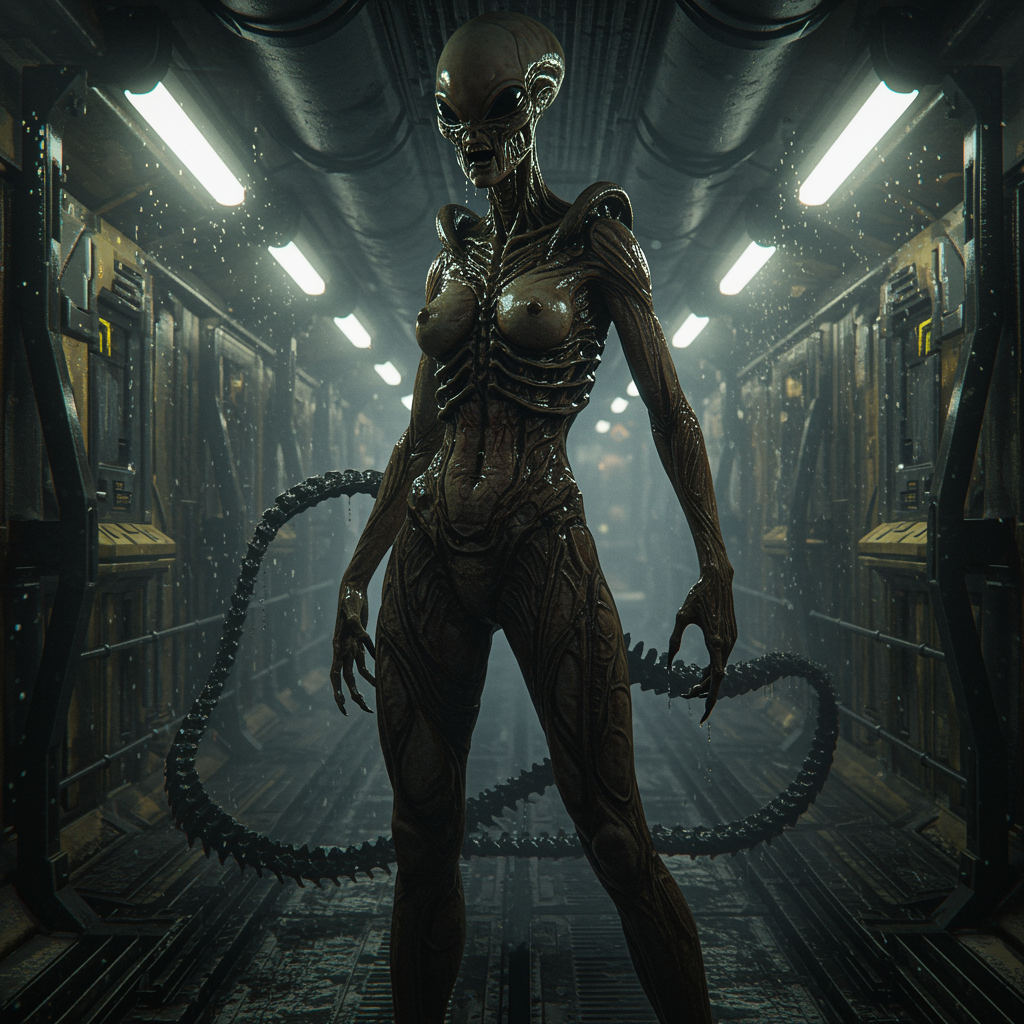 A hyperrealistic, photorealistic masterpiece of a creepy alien creature with intricate alien skin and clothing, set in a detailed, damp and steamy spaceship corridor. The sci-fi setting features flickering halogen lamps casting shadows in muted dark colors. The alien strikes an aggressive, sultry pose, showcasing a full body with a perfect face and detailed features. Its well-defined form is adorned with alien tattoos and scars, with smudged oil and grease giving the skin a slick, reflective texture. Water drips from its wet skin, evoking the eerie atmosphere of The Alien film franchise. The scene is captured in 8K UHD with a RAW, analog style, echoing the aesthetic of HR Giger, Aaron Horkey, and Jeremy Mann. The intricate details in the alien’s body and skin reflect a complex design, with hints of mutation and disconnected limbs adding an unsettling, otherworldly feel. The image is professionally color graded with muted LUTs, enhancing the atmospheric tension of this sci-fi concept art.