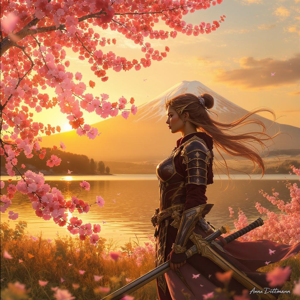A captivating portrait of a female warrior standing gracefully by a serene lake, surrounded by blooming cherry blossoms and the majestic silhouette of Mount Fuji in the background. Itβs springtime at sunset, casting a warm and vibrant glow across the scene. The image is centered and intricately detailed, capturing her breathtaking beauty with precise digital art techniques. The composition exudes a comprehensive cinematic quality, infused with the signature style of Anna Dittmann. The volumetric lighting enhances the intricate patterns and textures of her armor, while subtle watermarks and artist details are seamlessly integrated into the artwork.