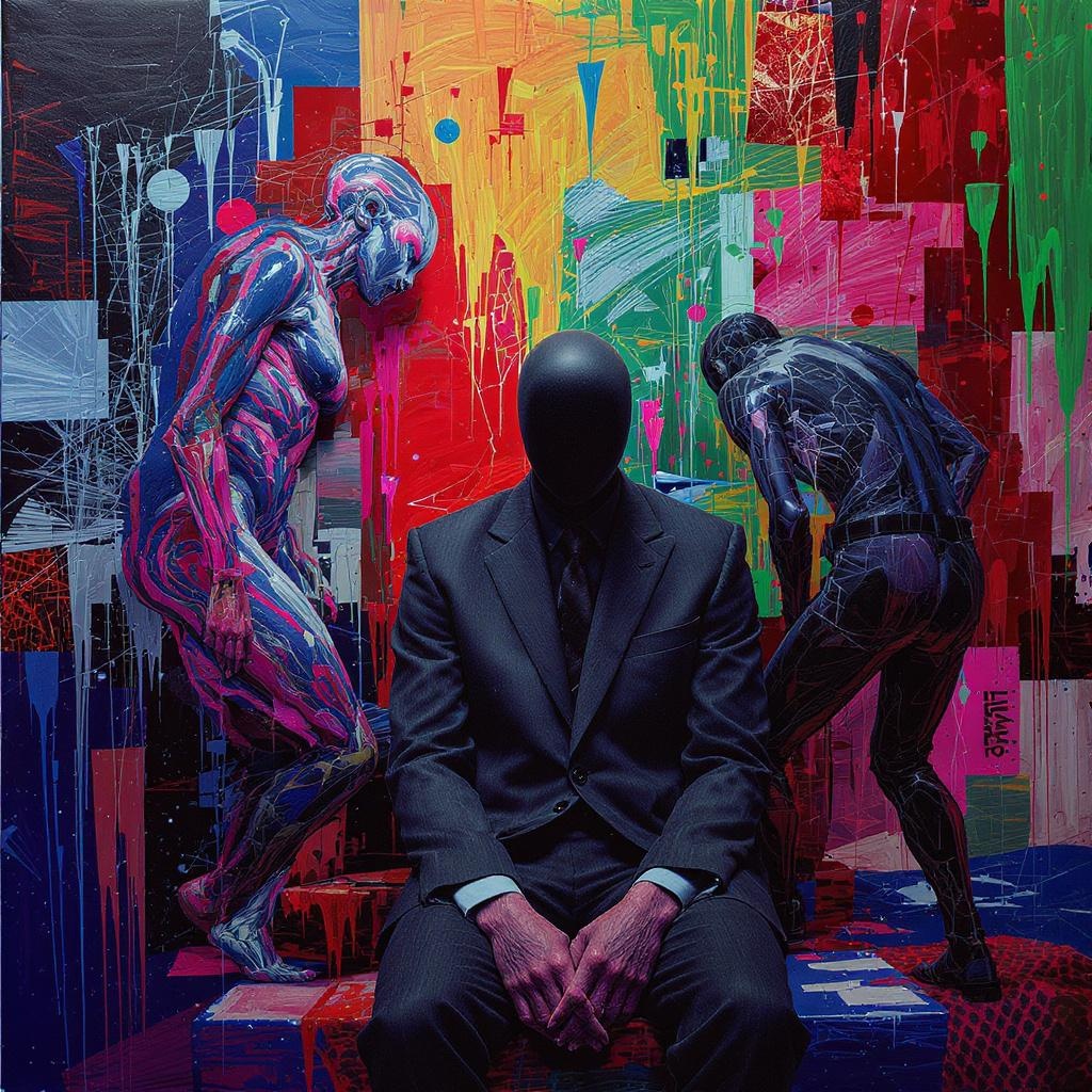 View this AI-generated image featuring a surreal abstract artwork depicts three figures immersed in a dynamic tapestry of color and form the central figure seated in a charcoal suit displays an unsettling featureless visage with shadowy indistinct features that fade into the surrounding hues to the