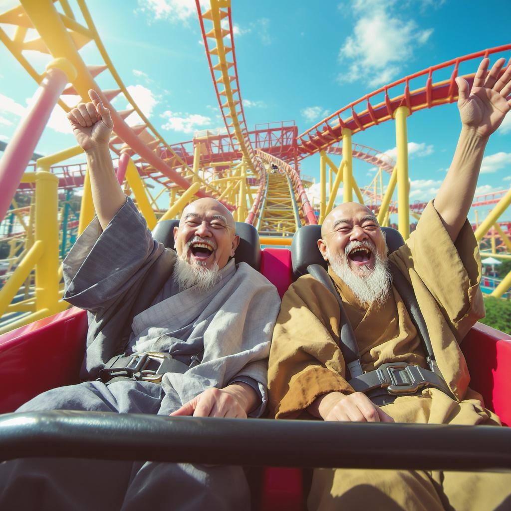 View this AI-generated image featuring in an outdoor amusement park on a bright sunny day two elderly zen monks clad in traditional zen robes are captured in a moment of pure joy as they ride a rollercoaster with their arms thrown up in delight their faces beam with laughter and wonder the cinematic