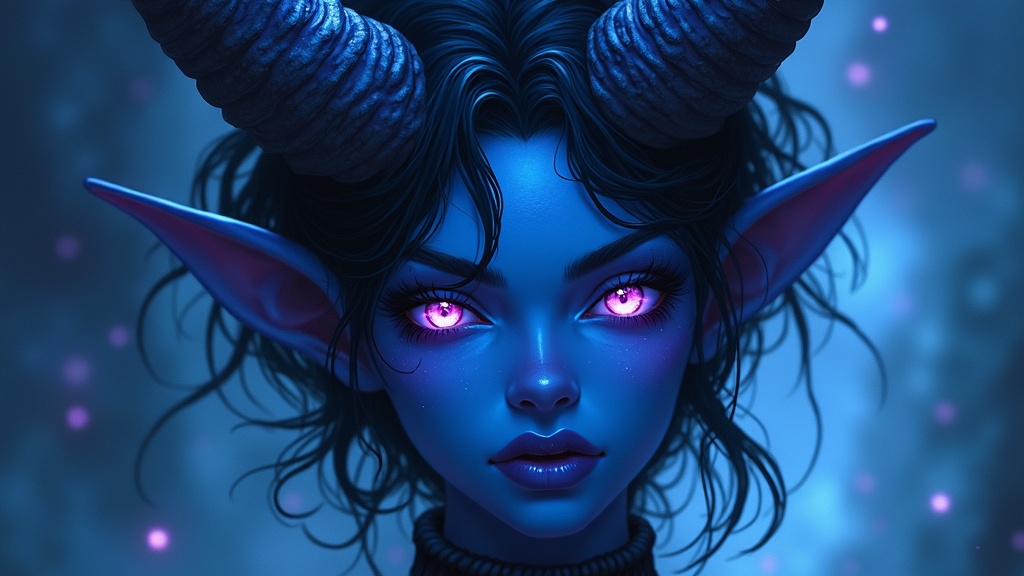 A captivating portrait of a blue-skinned tiefling woman, her cosmic aura radiating an ethereal glow. Her lush, curling horns, reminiscent of an oni, frame her face, adding an air of mystique. Her demonic features are intricately detailed, blending the allure of anime with the rich textures of an arcane painting. Her enchanting eyes, filled with a mischievous glint, reflect a deep connection to the realms of Dungeons & Dragons, while her expression balances elegance and enigma. The background subtly hints at a stellar landscape, enhancing the celestial essence of this demon girl, drawing you into her otherworldly charm.