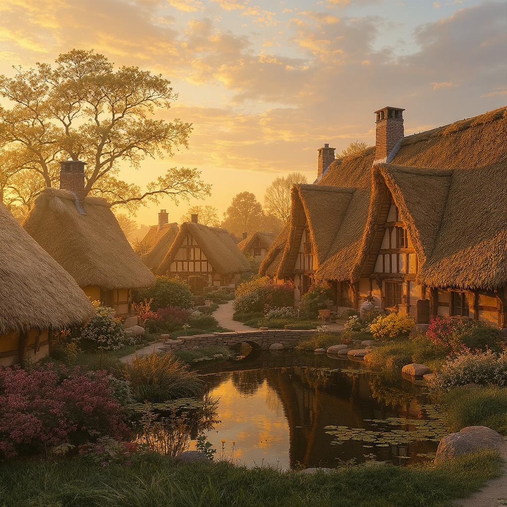 View this AI-generated image featuring medieval cottages with timber framing and straw thatched roofs surround a tranquil communal pond capturing a sense of pastoral charm under the warm glow of a sunset the scene features detailed rustic elements reminiscent of vermeer s style blending photorealism