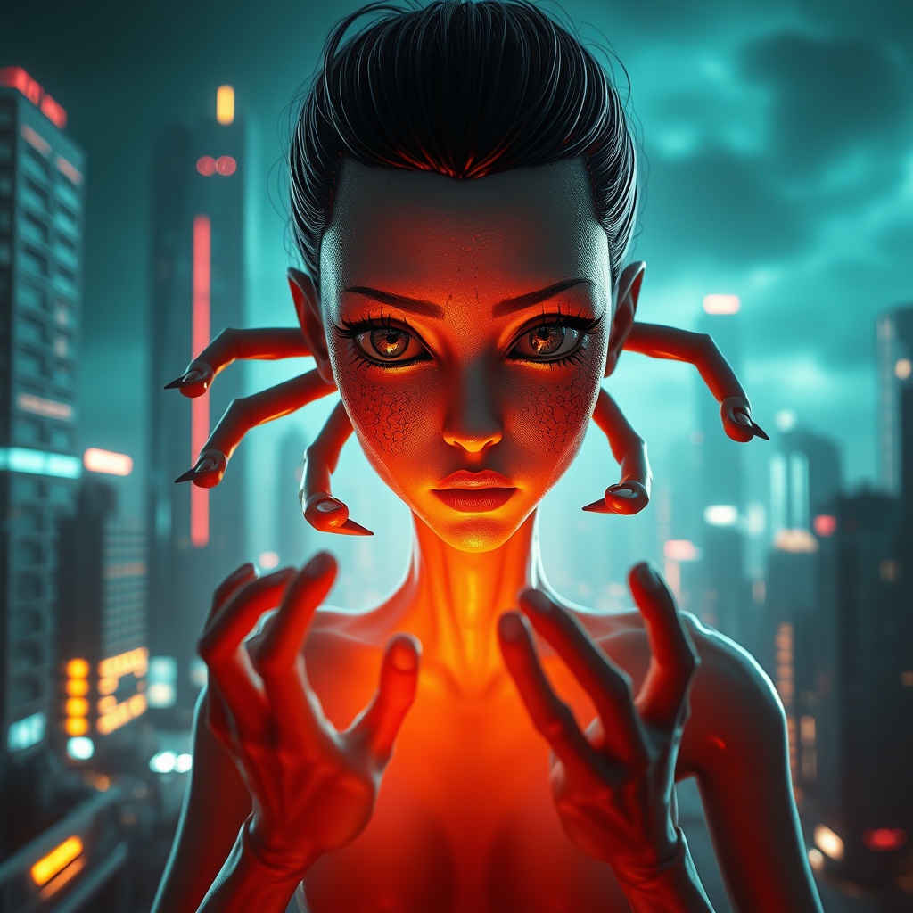 Portrait art of a futuristic cityscape, 8k ultra realistic, dynamic lens flare, moody atmosphere, vibrant glow, highly detailed and intricate, rich in color, cinematic lighting, popular on art platforms, 4k resolution, hyperrealistic, with extreme focus and details, utilizing Unreal Engine 5, cinematic quality, a true masterpiece with artistic reflections, photographic elements, breathtaking environment, Hyperrealism vehicle, CGI effects, 3D rendered, doll-like figures, octane render, surreal anatomy, intentionally blurred and fuzzy, multiple arms and fingers, abstractly drawn hands, disfigured and distorted forms, surreal mutations.