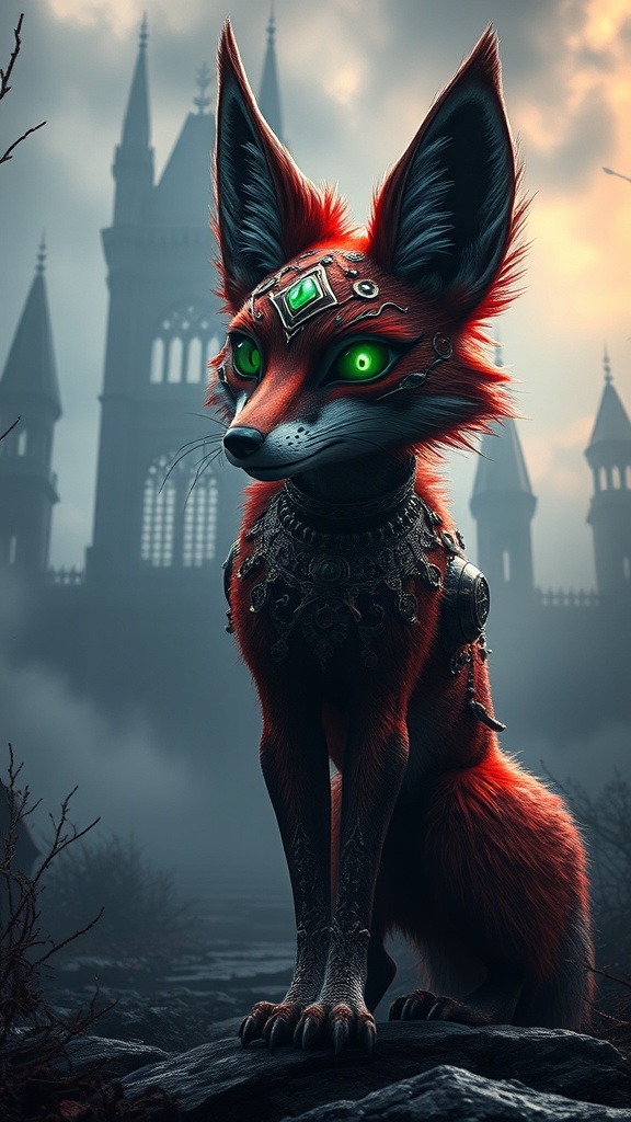 A steampunk crimson fox with intricate metallic embellishments and glowing emerald eyes stands in an eerie, atmospheric gothic landscape. Mist-shrouded architecture reminiscent of Lovecraftian tales looms in the background, exuding an air of ancient dread. The scene, rendered in a Midjourney style, is captured with hyper-realistic details using ray tracing technology, creating a deeply immersive experience. Heavy shadows intertwine with pockets of soft, natural light, casting a dramatic contrast that highlights the fox's elaborate design. The wide-angle perspective emphasizes the fox's lithe form and the brooding environment, evoking a sense of otherworldly magic. The digital art blends cinematic lighting and volumetric effects, resulting in a piece akin to a photo-realistic painting trending on ArtStation. This concept art balances smooth, sharp focus with intricate, excessive detailing, creating a vivid portrayal of dark fantasy steeped in mystery and allure.