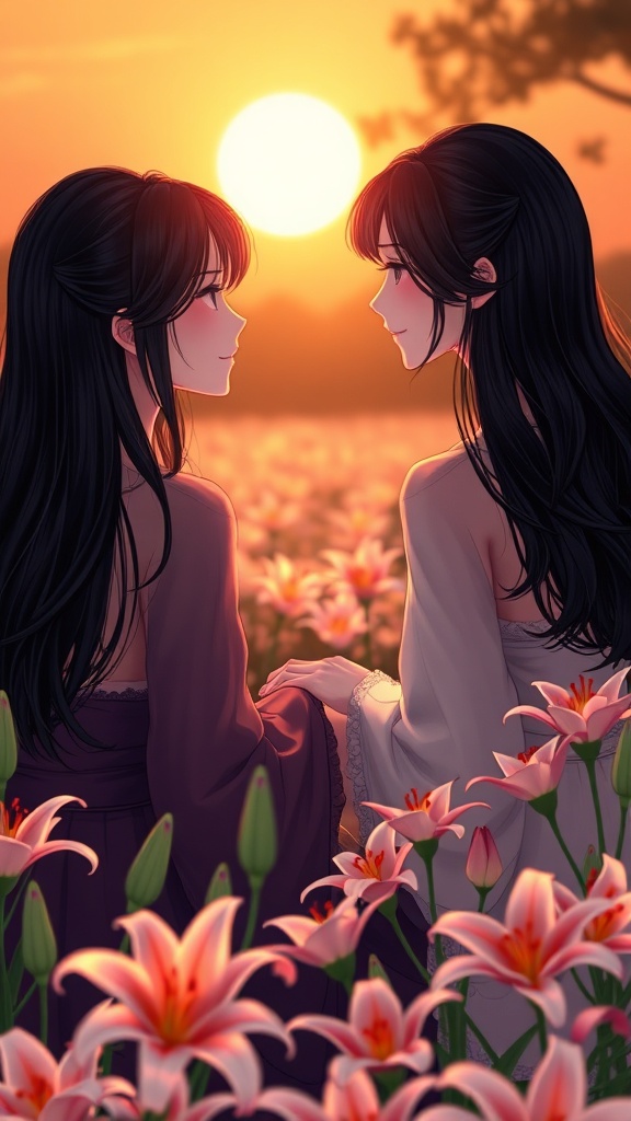 Two enchanting Japanese women with captivating grace sit amidst a tranquil field of blooming lilies, their gazes locked in mutual admiration. Their hip-length, raven-black hair cascades elegantly over their shoulders, framing their serene expressions. The setting sun casts a warm, golden glow on the scene, enhancing the vibrant colors of the lilies and adding a touch of magic to the moment.