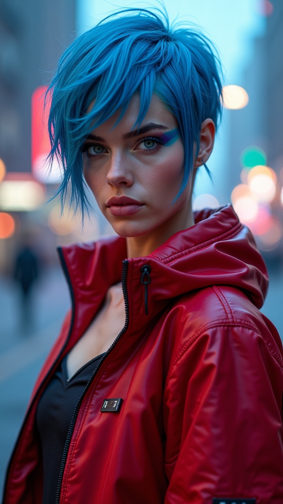 View this AI-generated image featuring face portrait cinematic lighting photorealistic a girl blending features of grace kelly and kristen stewart wearing a cyberpunk outfit short metallic blue hair athletic physique vibrant red sports jacket striking blue makeup vivid hdr colors new york city coast