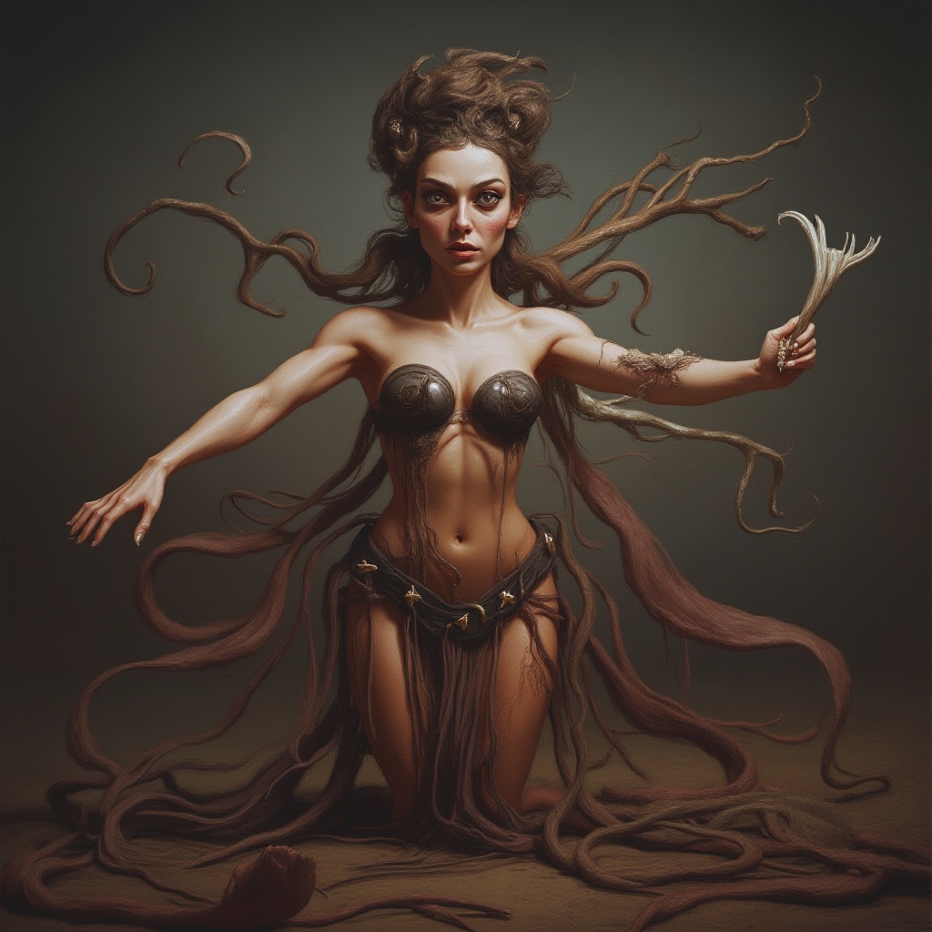 Masterpiece, best quality, incredible detail, ultra-detailed composition, trending on artstation, sharp focus, Absurdres, surreal stacked torsos, totem pole effect, unusual anatomy, extra and missing limbs, floating and disconnected arms, mutant forms, distorted features, abstract beauty mixed with unsettling elements, blurry edges, artistic metamorphosis, visually intriguing.