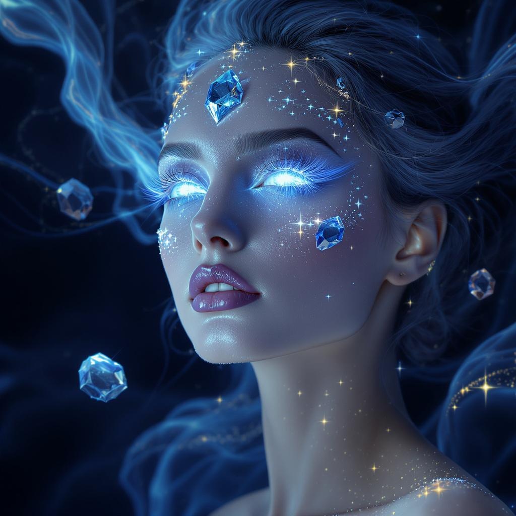 A woman of breathtaking beauty adorned with crystals of shimmering blue, these gems sparkle like jewels in her eyes, reflecting light in dazzling facets, while others float around her like celestial stars. Her skin exudes a luminescent glow, reminiscent of moonlight on a clear night. The background is an abstract blend of deep blue hues, with fluid shapes and subtle golden details that dance like threads of gold among gentle shadows. The photograph is captured in high resolution, showcasing intricate details in the textures of the crystals and her skin, with soft lighting that accentuates her delicacy, presented in a hyper-realistic style that seamlessly merges natural beauty with enchanting surrealism.