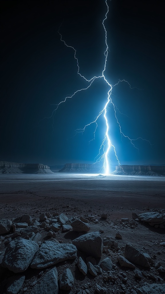 View this AI-generated image featuring a breathtaking photograph captures the electrifying moment of a lightning bolt piercing through the night sky over an expansive desert landscape the intense flash of light creates an ethereal glow highlighting the stark beauty of the rocky desolate terrain belo