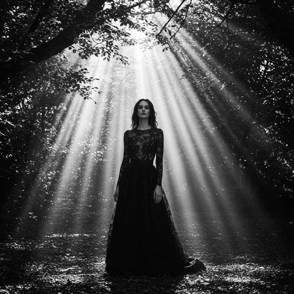 A stunning black and white fashion editorial captures a breathtaking figure of a beautiful dark-haired woman clad in an elegant dark lace gown amidst a sunlit forest. The scene is set with rays of light filtering through tree branches, casting intricate shadows and highlighting the dramatic sky above. The high-resolution, realistic photograph features a professional, cinematic angle that emphasizes the dynamic play of backlit illumination. The overall effect is a masterful blend of light and shadow, bringing the ethereal moment to life with an artistic flair.