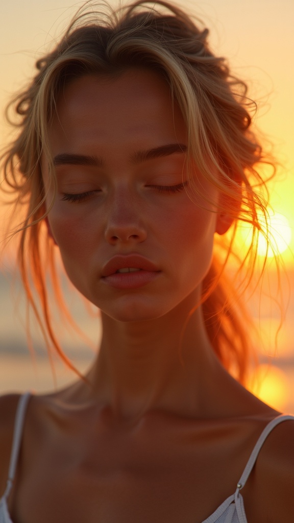 A portrait of a young woman with a cute and finely detailed face, depicted in an elegant fantasy style. Her pose is reminiscent of a cowgirl, with her arms gently positioned behind her back. The setting is a serene beach at sunset, where cinematic and gradient lighting enhances the intricate details of the scene. The overall composition captures a sense of tranquility as her eyes are softly closed, bathed in the warm glow of the fading sun, resulting in a high-resolution masterpiece.