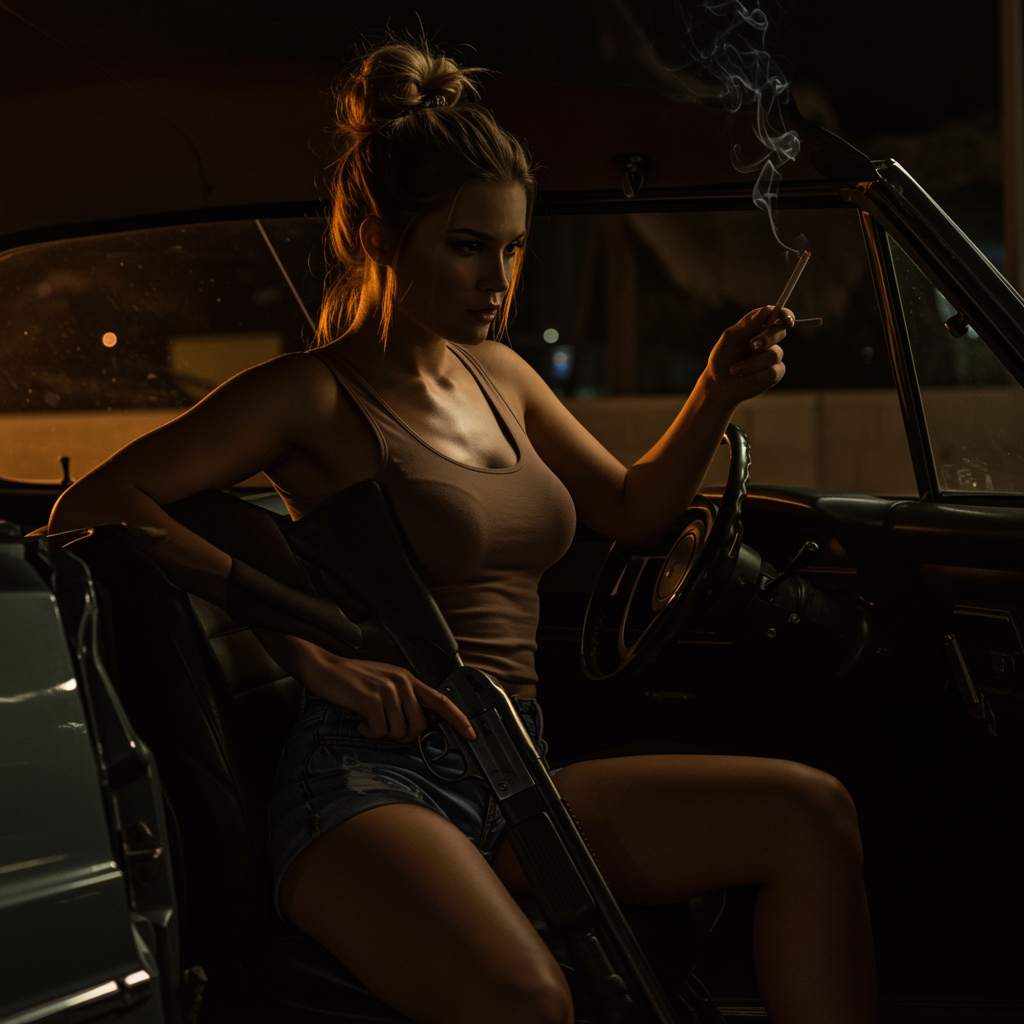 View this AI-generated image featuring a confident woman waits inside a dimly lit car her sawed off shotgun resting on her lap she wears a snug tank top and denim shorts that highlight her curvy figure her long hair is artfully tied into a bun and a wisp of cigarette smoke curls through the air the