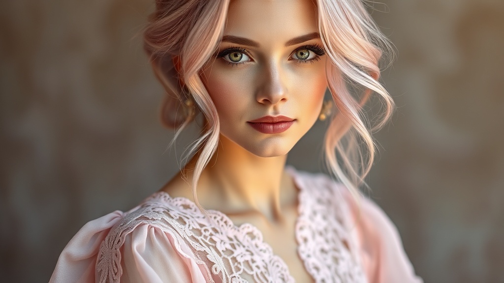 A woman with delicate pink hair styled in soft waves, adorned in a flowing pink lace dress, captured in stunning hyperrealism and photorealism. The image features a soft-focused realism with pastel hues, embodying an ethereal babycore aesthetic, set against a gently blurred background that accentuates the elegance of her attire and serene expression, in an ultra-high-definition vertical composition with intricate detail.