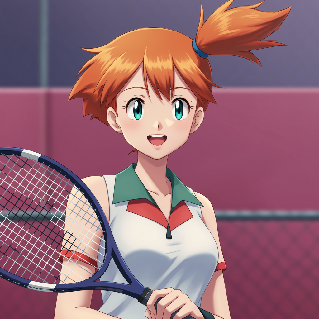 View this AI-generated image featuring a close up of a young woman in a classic tennis uniform holding a racket exuding the energetic and adventurous spirit reminiscent of misty from pokemon her hair is tied back capturing that vibrant 80s and 90s anime aesthetic with a slight wind swept look her ex