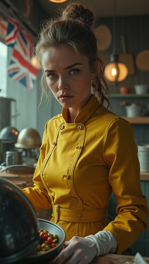 In a futuristic, sci-fi-inspired restaurant setting, an aggressive female cook stands at the center, her intricate and detailed Chartreuse earthy green uniform reflecting the dieselpunk theme. The fabric showcases realistic details and folds, adding depth to her dynamic action posture captured in a dramatic, cinematic low-angle shot. Her wide-open eyes with a raised eyebrow and angry facial expression convey the frenzy of preparing uninspiring and monotonous dishes. The scene, rendered in 8k resolution, highlights the highest facial details, emphasizing her frustration amidst a simple, monochrome background with low contrast. Despite the uninspired surroundings, the subtle presence of a hard-surfaced helmet and flags, including stars and stripes alongside the union jack, adds a sense of regality. The low background noise further centers the focus on this culinary artist's passionate yet tumultuous moment.