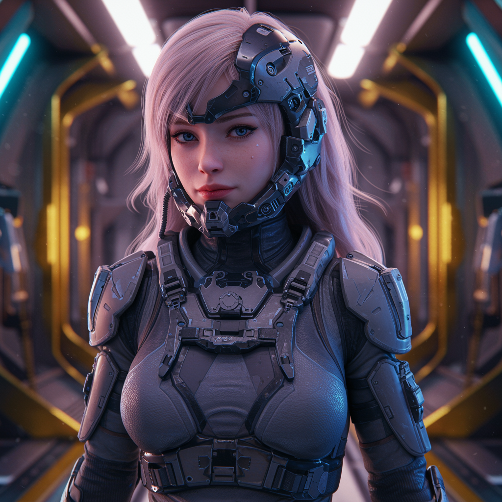 Here's the modified prompt: A captivating portrait of a girl with an athletic physique, shown in a dynamic action pose. Her face displays a mix of frowning and innocence, complemented by clear, striking features. She's adorned in advanced combat exo-armor with a closed breathing system. Her sci-fi helmet, equipped with a sleek, high-tech visor, has cinematic lighting accentuating her expressions. Set within a detailed, intricate interior reminiscent of the style from TV's The Expanse, the scene is enriched with vibrant neon and volumetric lighting, creating a captivating, immersive atmosphere. Captured using a Canon EOS 5D Mark IV DSLR with an aperture of f/8, a shutter speed of 1/250 sec, and ISO 100, the depth of field is exquisite, offering photorealistic detail. Her hair tail is gracefully illuminated, with hints of natural reflections and textures, adding dynamism to the composition. The setting features sleek symmetry with hints of gold accents, combining both artistic and realistic elements. The overall ambiance captures a moment of intense emotion and futuristic allure without any distortions or imperfections, providing a polished and striking visual narrative.