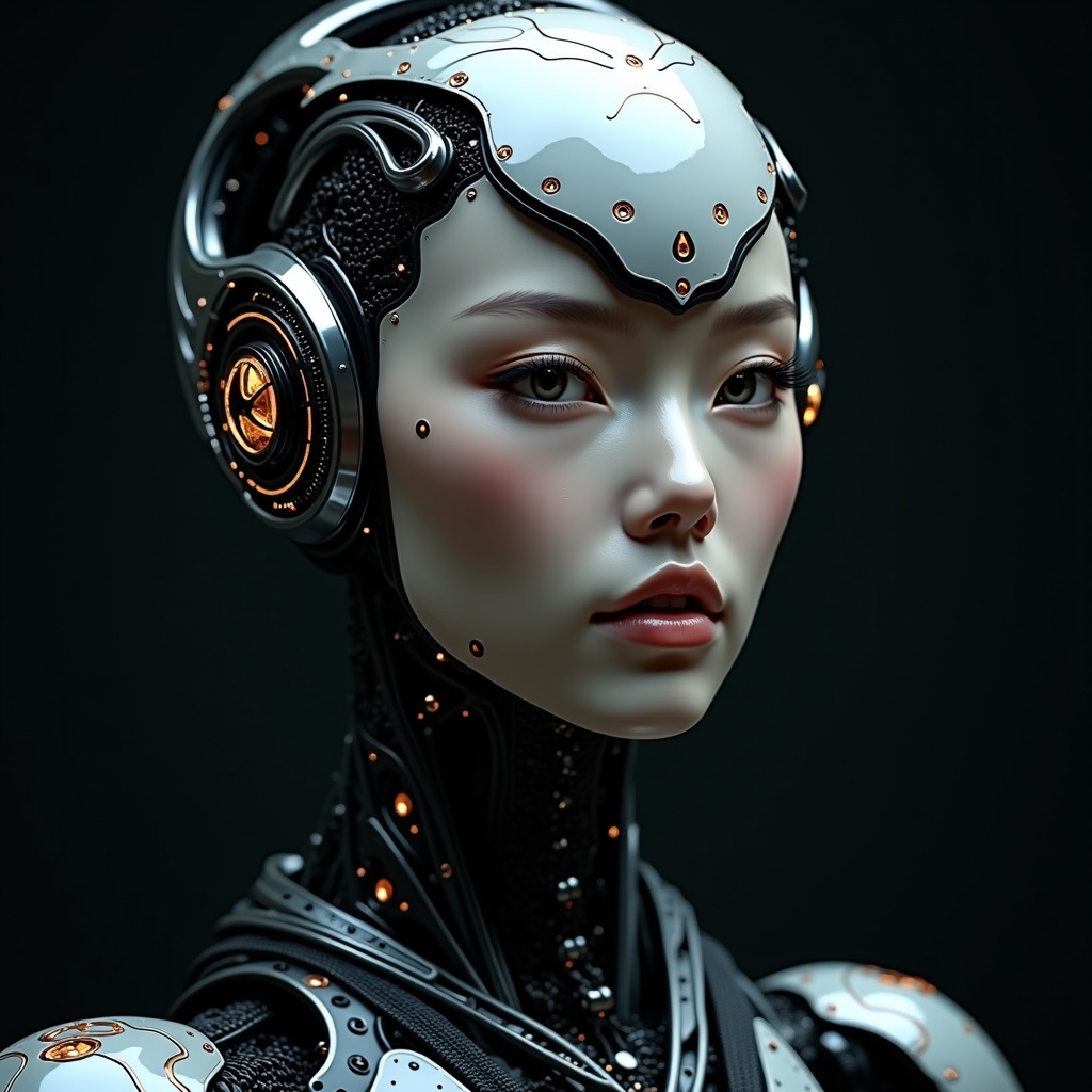 View this AI-generated image featuring a futuristic woman adorned in intricate robotic headgear her visage a harmonious blend of dark white and dark black her design gracefully integrates the elegance and fluidity of ancient chinese art as flowing lines and subtle patterns adorn her metallic frame t