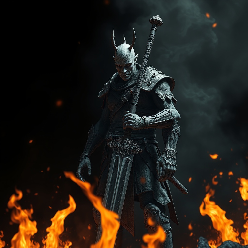 View this AI-generated image featuring a dark souls like warrior stands with a greatsword pointing downwards set against a detailed black background the scene is dichromatic with fiery elements evoking the intense flames of a fire temple the visuals are enhanced with a uhd hdr effect achieving an ab