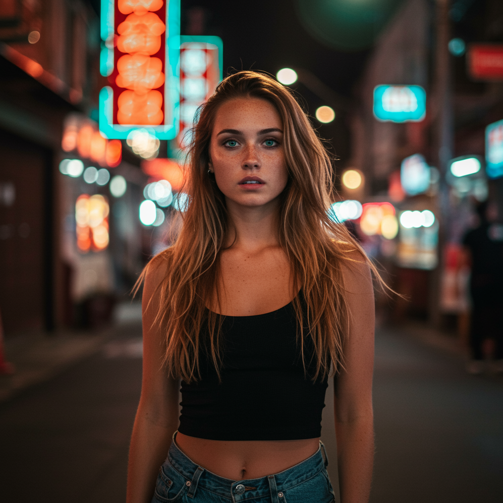 A stunning full-body portrait of a young supermodel with captivating green eyes, posing against the vibrant backdrop of an Asian market at night, lit by the glow of neon signs and city lights. Her perfectly symmetrical face is framed by long, flowing hair reminiscent of cascading ink, complemented by delicate makeup that highlights her high cheekbones and delicate freckles. The model, with her perfect fitness body and long legs, exudes an aura of mystery and melancholy through her expressive doe eyes. Shot with an aperture of 1.8, the image features a dramatic bokeh effect with lens flares, captured in ultra-high-definition 8K and HDR quality. The cinematic lights illuminate her surroundings, adding an extradimensional touch to the scene, as if her presence is intensified by the vibrant, ever-changing market around her.