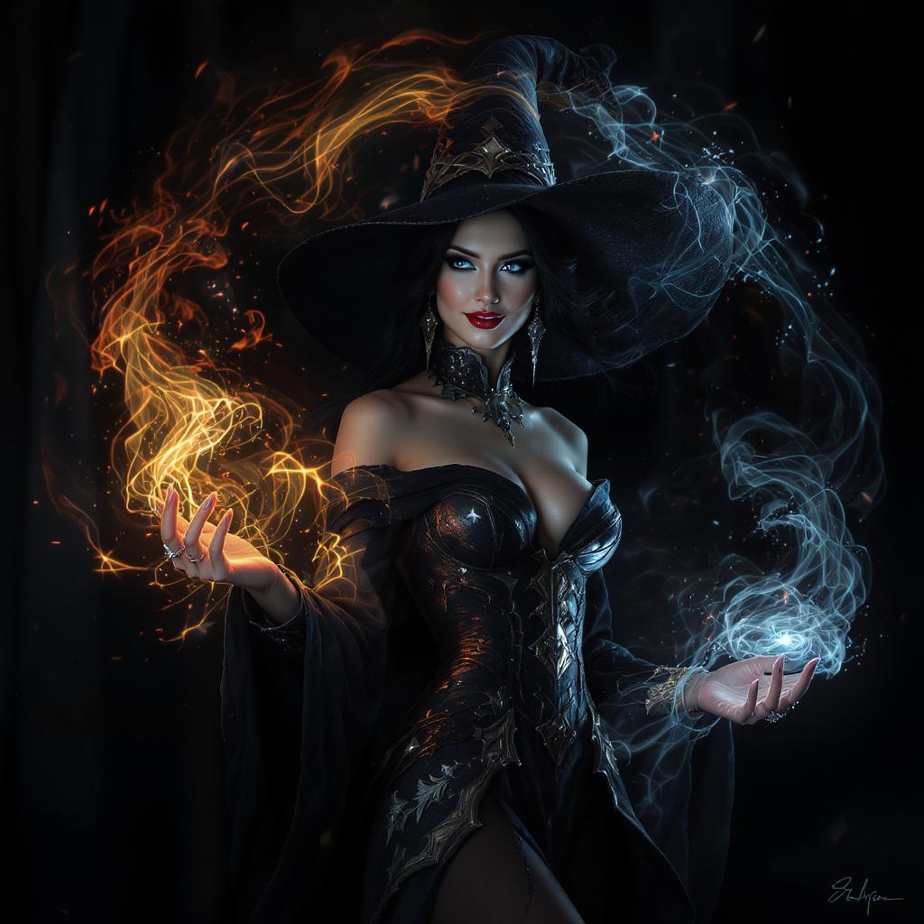 In a mesmerizing dark fantasy realm, a strikingly elegant slim female wizard stands confidently as she conjures a bewitching spell. Elemental energies elegantly intertwine around her, creating a captivating dance of fire, water, wind, and ice. She is adorned in a captivating off-shoulder ensemble, rich with complexity and detailed textures, her fingers adorned with elaborate rings that glint in the dim light. Her flawless, luminous skin radiates under a gentle, otherworldly light, accentuating her enchanting blue eyes and a bewitching smile. The elements' seamless and dynamic choreography forms an awe-inspiring, ultra high-resolution masterpiece, immersing the viewer in a scene of magical grandeur.