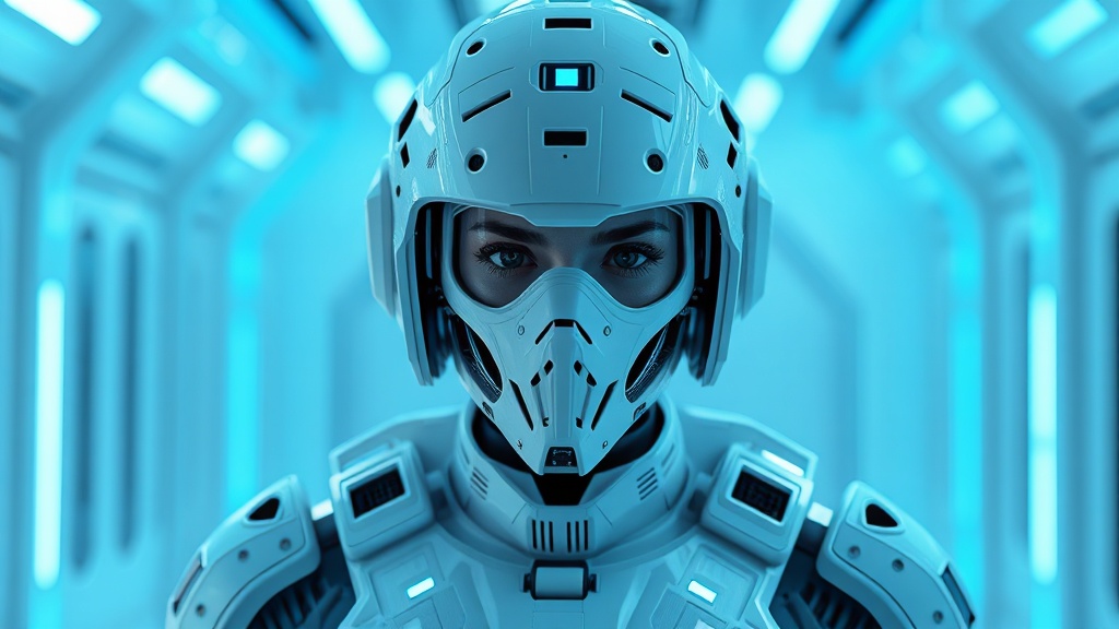 View this AI-generated image featuring female sci fi white military cyborg intricate helmet design concealed mask sleek white teflon armor with geometric patterns cyberpunk aesthetic vibrant neon blue accents technical white room environment pulsating blue energy beams in the background illuminated