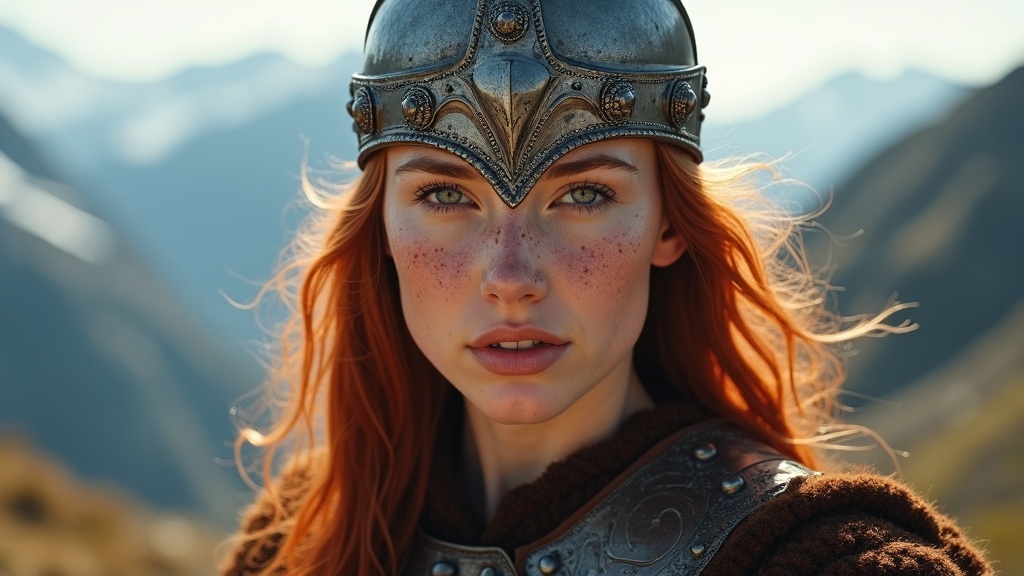Portrait of a young woman embodying the spirit of a Viking, her fiery red hair cascading in loose waves and freckles adorning her sun-kissed skin. Her eyes, meticulously detailed, gaze with determination. She is clad in intricate Viking armor, every piece telling a story of battles fought. Atop her head rests a finely crafted Viking helmet, gleaming under the bright sunlight. The scene captures her against a backdrop of majestic mountains, their peaks kissed by the sun. The composition is cinematic and realistic, with lighting that adds an epic, dramatic flair. Every detail, from the glint of metal to the play of light and shadow on her face, is rendered with extraordinary precision, creating an intensely compelling portrait.