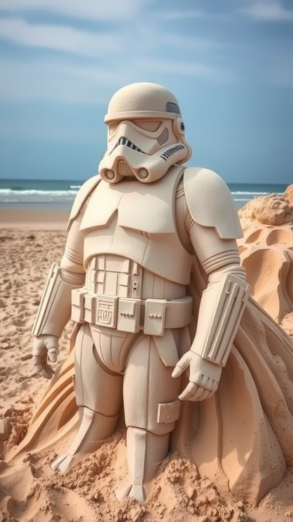 A breathtaking sand sculpture resembling a stormtrooper stands proudly on the beach, adorned with intricate details that capture the essence of its iconic armor. The sculpture boasts stunning craftsmanship, with every ridge and contour carefully carved to perfection, blending seamlessly with the natural beauty of the sandy shoreline. It stands as a testament to creativity and skill, a captivating piece that draws the admiration of all who visit.