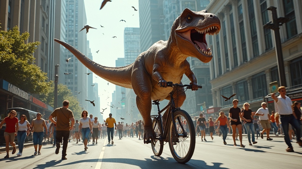 View this AI-generated image featuring a lifelike tyrannosaurus rex pedaling furiously on a bicycle down a bustling city street its massive tail whipping behind the scene is filled with chaos as a diverse crowd of people flees in panic their expressions a mix of terror and disbelief some dropping sh