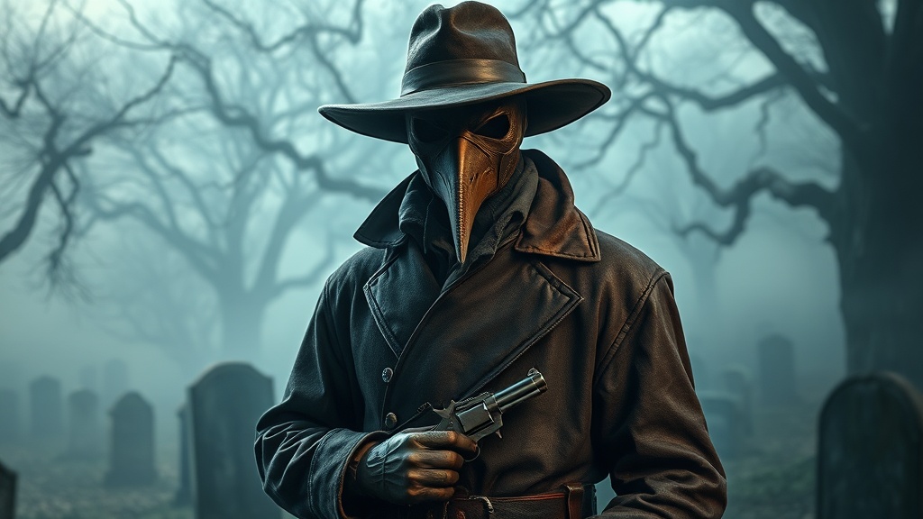 A 17th-century plague doctor stands amidst a fog-laden graveyard, shrouded in an air of mystery and foreboding. Cloaked in weathered leather, the iconic wide-brimmed hat casts dramatic shadows under cinematic lighting, while the beaked mask conceals their face, adding an air of intrigue. In a unique twist, a 6-shooter revolver rests confidently in a leather holster at their side, blending history with a touch of anachronistic fantasy. The scene captures the eerie beauty of the medieval environment in highly detailed 8k resolution. Every feature, from the intricate stitching of the leather attire to the sharp gleam of the revolver, is rendered in a hyper-realistic style. The composition plays with contrast and sharp focus, bringing to life the ethereal fog that weaves through ancient tombstones and gnarled trees, immersing the viewer in an epic, photorealistic vision of a bygone era reimagined.