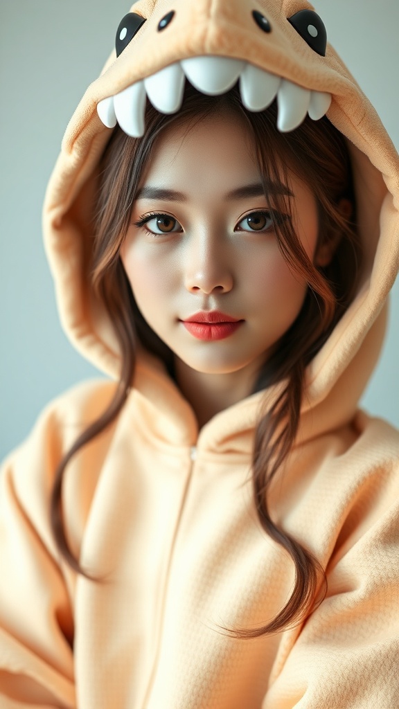 View this AI-generated image featuring a stunning female k pop idol dressed in an adorable dinosaur costume her face clearly visible captured in a close up portrait using a sony a1 with an 85mm lens at iso 100 the image has a medium format quality with 45 megapixels featuring studio lighting enhance