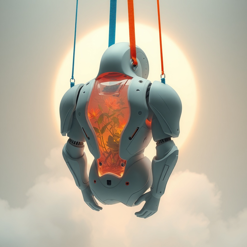 In a visionary photoshoot set in a futuristic realm, an advanced alien armor takes center stage, showcased in an artsy composition that blends technology and organic elements. The armor, crafted from a semi-translucent, frosted matte material, exudes a smooth surface, revealing a soft, cloudy translucency that hints at its intriguing interior. Within, glowing flora and minimal electronic components cast gentle hues of orange and green, creating a harmonious fusion of biotechnology and nature. The armor's design breaks away from traditional humanoid forms, embracing abstract and avant-garde aesthetics with elongated, flowing curves, unconventional geometric shapes, and unexpected joints, epitomizing an alien-like organic structure. Its exterior is sleek and minimalist, lacking a humanoid outline, suggesting a futuristic and imaginative design that is fluid and unconventional. Suspended in mid-air, the armor is held by vibrant mooring straps in electric blue, neon orange, and vivid green, which dramatically contrast with the soft matte finish, echoing a high-end art installation. The background is minimalist with neutral tones and soft gradients, keeping the focus on the armor. Subtle hints of organic elements like moss, exotic plants, and alien-like flora in vibrant yellows, purples, and greens add life to the clean and technological aesthetic. An unconventional camera angle, extremely close to the armor, allows an in-depth view of its intricate details, including the texture of the frosted material and the vibrant, chaotic mooring straps that crisscross in the backdrop. Lighting is soft yet precise, creating gentle reflections and highlights on the armor’s surface, emphasizing the contrast between the glowing plants, minimalist structure, and bold, neon straps. Captured in an ultra-realistic, hyper-detailed 35mm photography style, the shot evokes the essence of a high-tech fashion magazine, with every detail sharp and vivid, drawing the viewer into this ethereal display. This photorealistic scene embodies the allure of a futuristic melee of technology and nature.